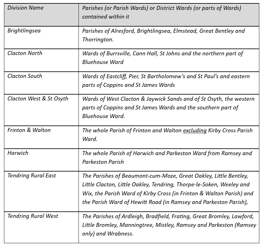 The boundaries of Tendring’s eight divisions have changed since voters last went to the polls in 2021, with new boundaries drawn up by the independent Local Government Boundary Commission. It includes the creation of a new Clacton West & St Osyth division, replacing the former Clacton West division. Full details of the new boundaries can be found here.
